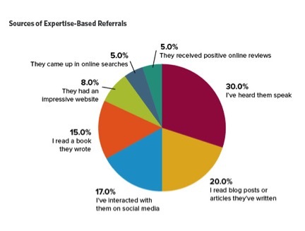Online content based on a thoughtful content strategy can help you reap “expertise-based referrals” (referrals made based on a buyer’s view of a firm’s specialized expertise). As you’ll see in the figure below, reading blog posts motivates 20% of this type of referral.