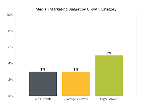 When we analyzed marketing budgets, we found the high-growth cohort had a median marketing budget of 5% of annual revenues. Both average- and no-growth firms had median marketing budgets of 3%. Further, an impressive 36% of high-growth firms invested 10% or more of annual revenues in marketing (compared to 23% of no-growth firms).