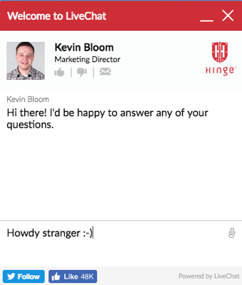 - Chat features and supporting business processes. With all of the interest in deepening visitor engagement and interaction, it is amazing to see the relative scarcity of chat options on professional services websites! Chat features are often dismissed as being too “salesy” or demanding too much support from business development teams. But the data speaks for itself when it comes to engagement and results. Visitors who use live chat are 20% more likely to buy. At Hinge, we recently tested live chat and found it profoundly useful — and relatively inexpensive and painless to deliver. As visitors’ buying behavior evolves, they become more likely to take a first step through chat. To a time-constrained audience, firing up a chat is less commitment than scheduling a call – but more immediate and engaging than filling out a contact form. Applied strategically, an option to chat can open a direct conversation that may have otherwise been missed.
