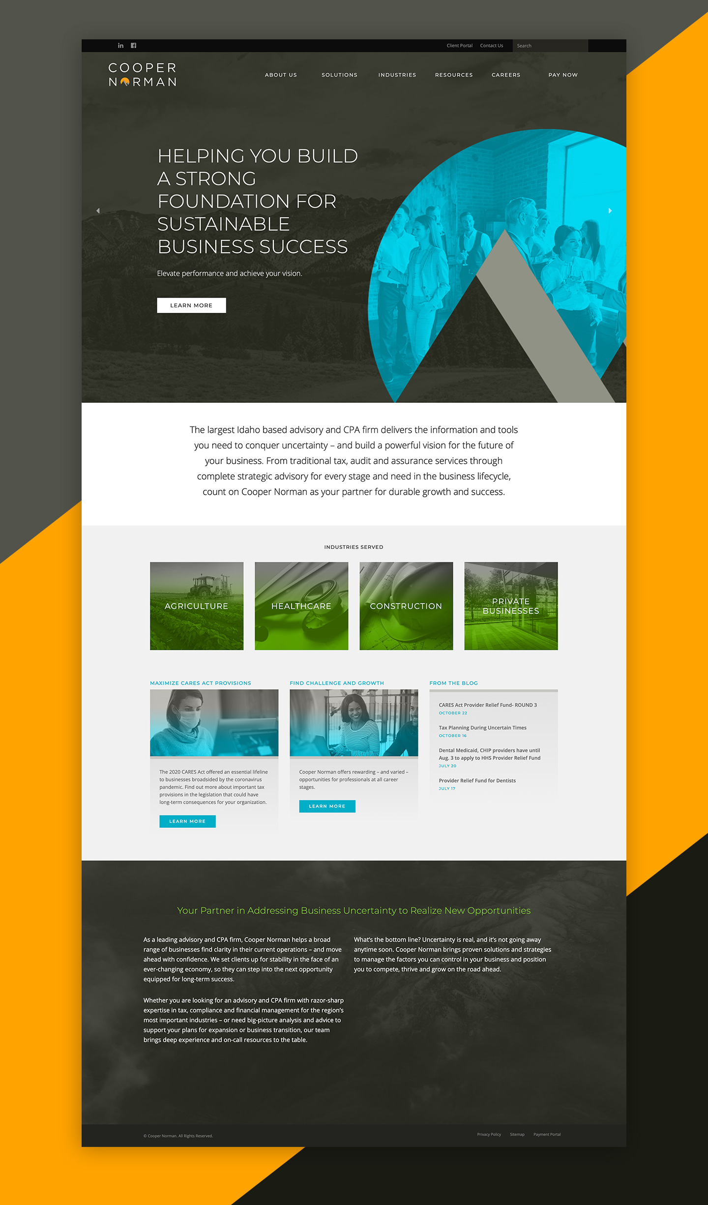 Idaho’s largest account firm was in need of a new brand that conveyed its reputation and stature. Hinge worked with Cooper Norman’s team to sharpen the firm’s positioning before reconceiving their visual brand and website. The result is a new look that communicates the firm's leadership position without losing sight of their western roots and friendly style.