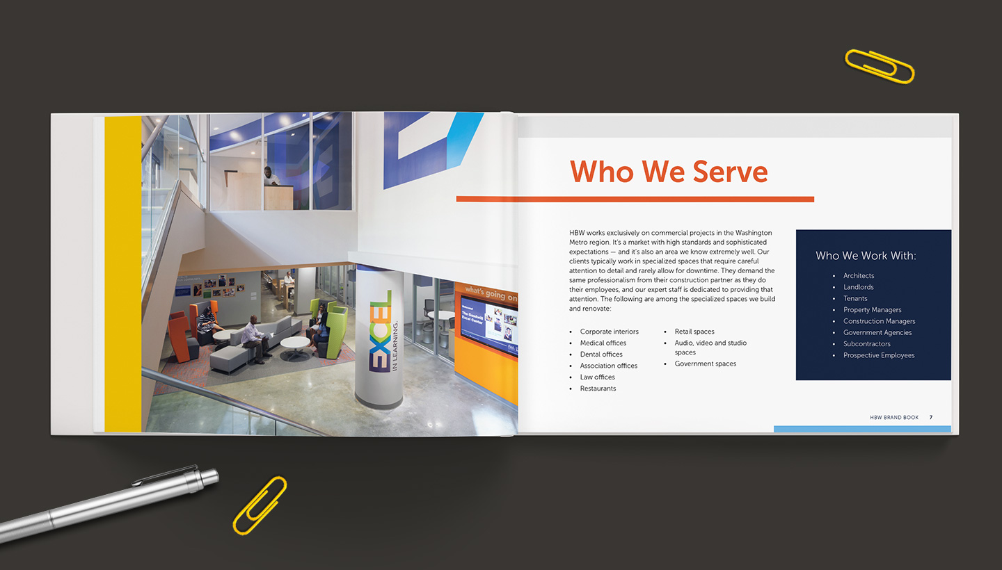 We had worked for months on this construction firm’s new brand, positioning and messaging. And it was time to tie all together. Hinge created this unique brand book to both show HBW's new brand in action and explain in clear, simple language how to deliver it to the marketplace.