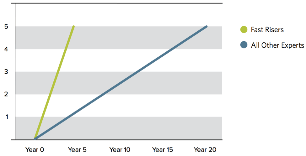 At first, this subset of experts — who we dubbed “Fast Trackers” — were a mystery. These professionals ascended from one Visible Expert level to the next astonishingly quickly, going from Level 1 to Level 5 in half the time it took the rest of the pack. On average, the Fast Trackers spent only ten months at one expertise level before rising to the next.