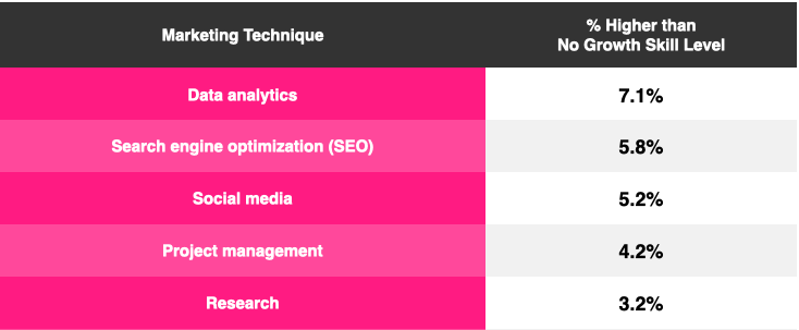 Two techniques that stand out are keyword research/SEO and conducting and publishing original research. In the case of both of these techniques, no growth firms report significantly less impact from their efforts—an indicator that something is not working.