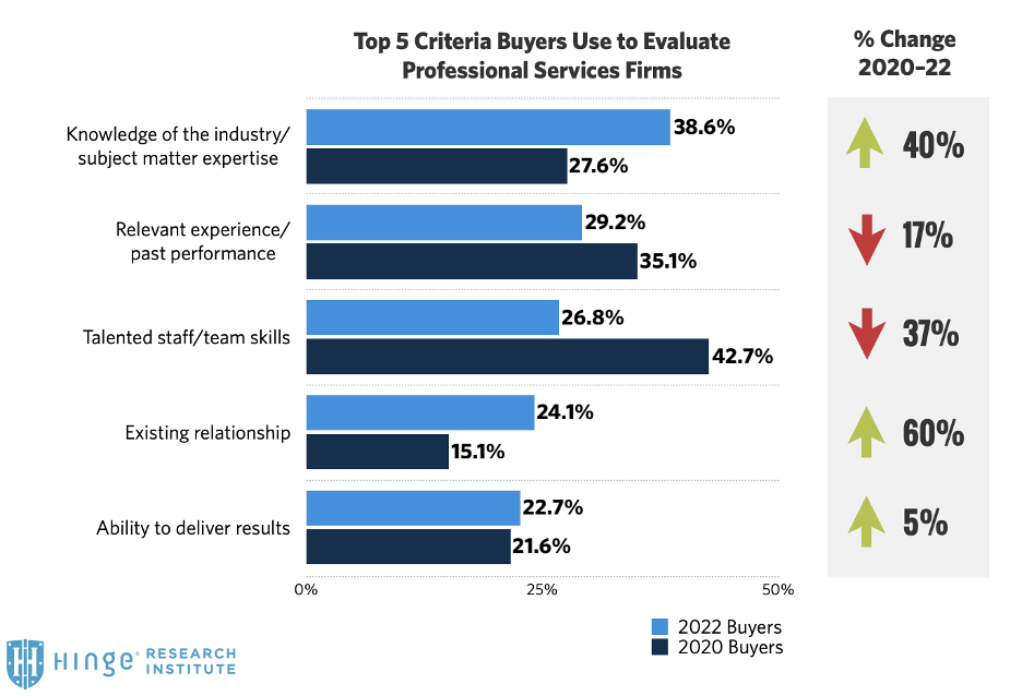 Nurturing existing relationships is still essential to getting additional engagements for consulting firms. We’ve noticed an ongoing shift toward subject matter expertise as the leading criteria for buyers at the early stages of the selection process. The graph below shows a 40% jump from 2020 to 2022.