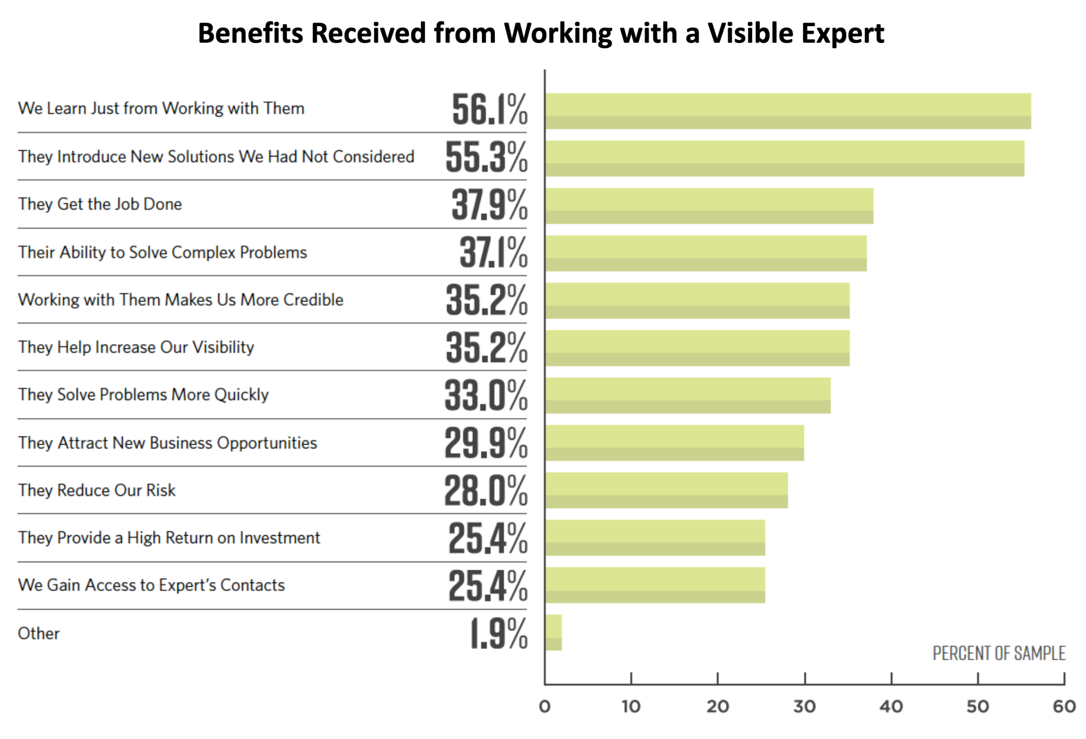 What about buyers? What benefits do they get by working with Visible Experts? In the following chart from our research on Visible Experts and their buyers, we learn that there are many ways that businesses benefit from working with Visible Experts.