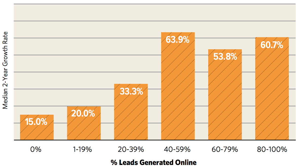 We found that firms’ growth rates rise along with the proportion of leads generated online, up until the point where forty percent or more of leads originate online. Firms that generated between forty and fifty-nine percent of leads online grew at four times the rate of those with no online leads.