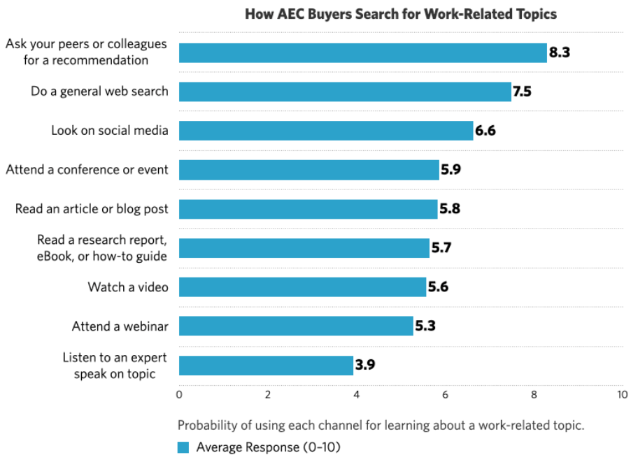 Most AEC buyers (65%) would recommend their current partner to a friend or colleague. But fewer and fewer friends and colleagues are bothering to ask. It’s quicker and easier to do a web search or check on social media.