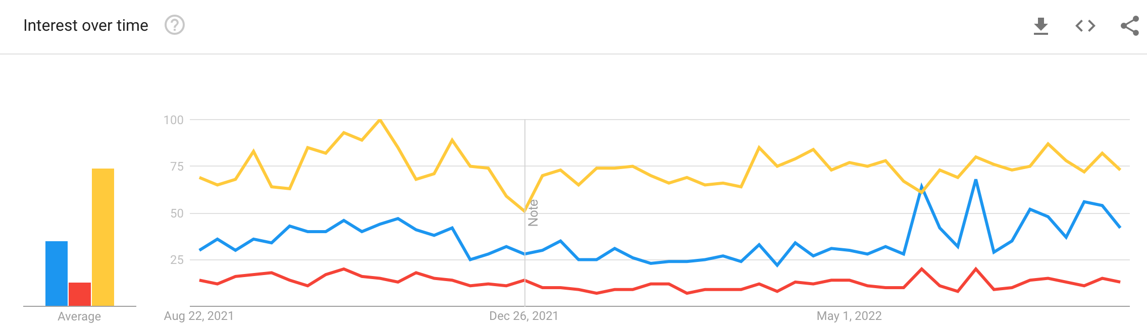 Interest over time is represented as a number between 0-100 at certain points over time. It reflects how many searches have been done for a particular term relative to the total number of searches done on Google over time. They don’t represent absolute search volume numbers.