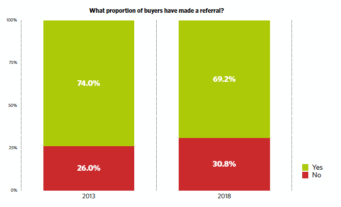 Professional services firms have historically relied heavily on referrals to generate new business. On average, nearly 70% of buyers made a referral for their service provider. Interestingly enough, this number has decreased nearly 5% since 2013.