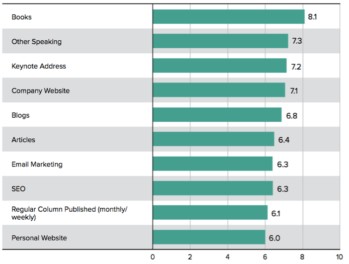 Here books take the top spot followed by speaking engagements (keynote and non-keynote). Their firm's website, blogging and other writing are also very important.