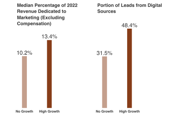 On average, High Growth technology & software firms allocated around 13% of their 2022 revenues to marketing and business development, not including staff compensation. High Growth firms also differ in the composition of their leads, generating nearly half of their leads from digital sources. No Growth firms get less than a third of their leads through digital channels.