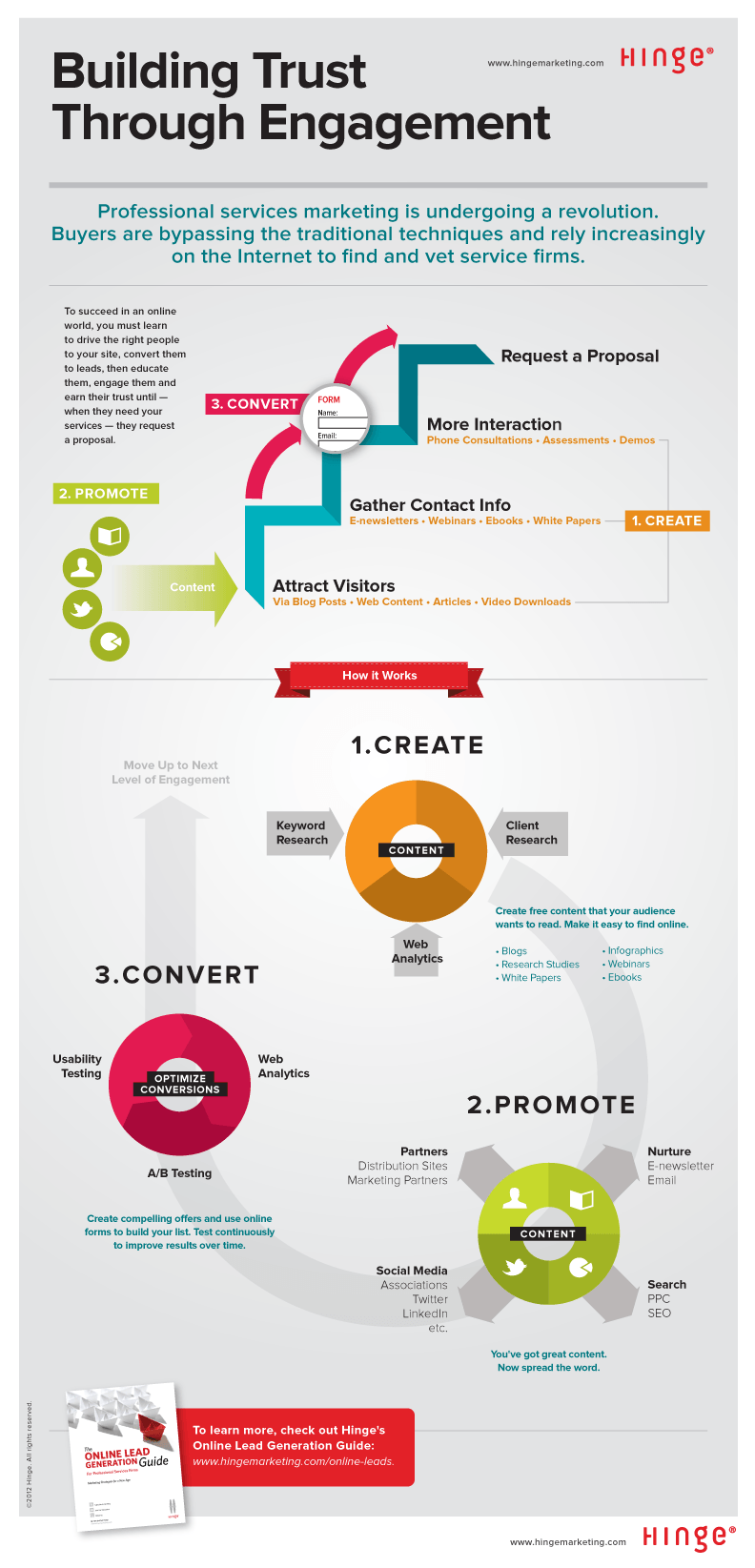 Finally, you convert them by presenting offers that move prospective buyers up the scale of engagement. Here your AB testing, web analytics and usability testing will help you optimize your lead generation process.